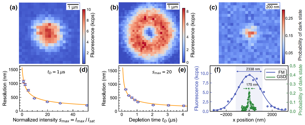 1单离子超分辨成像。(a)单离子荧光成像,(b)利用离子作为探针测量的耗尽光模式,(c)单离子超分辨成像结果,(d-e)成像分辨率与耗尽光强和耗尽时间的关系,(f)单离子荧光成像(FM)与超分辨成像(GSD)分辨率对比。