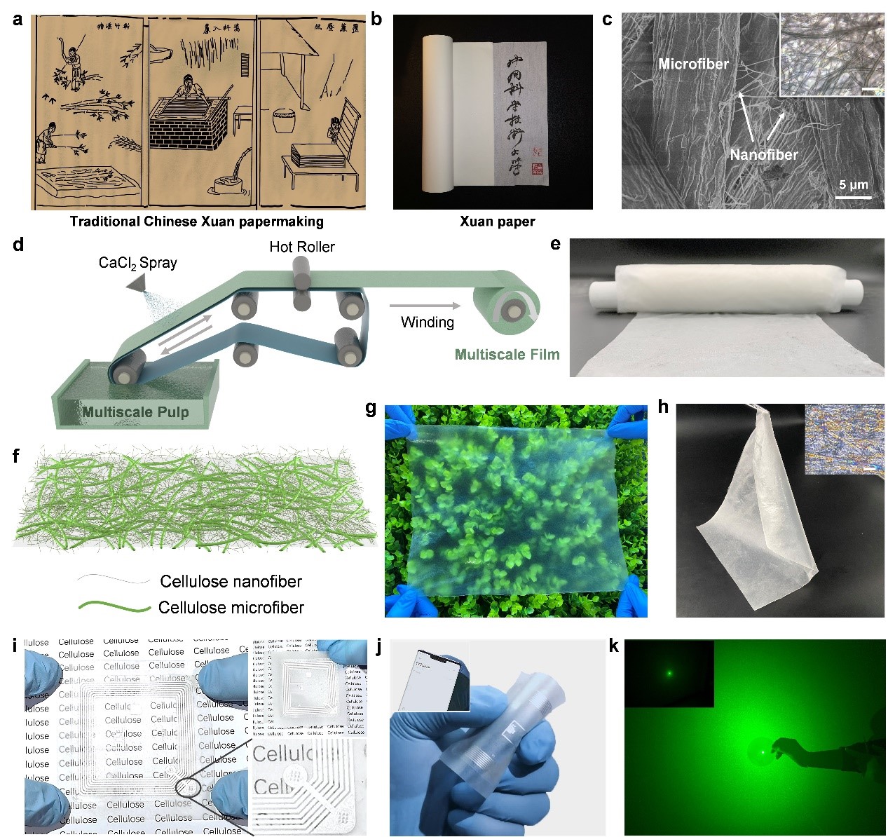 图.传统宣纸的表征和多尺度薄膜的制备,以及基于多尺度薄膜制备的柔性电子设备。(a)《天工开物》宣纸的工艺示意图。(b)宣纸照片。(c)宣纸的SEM图像和偏光显微镜图像(插图)。(d)多尺度薄膜的卷对卷生产示意图。(e)一卷0.5 m x 10 m的多尺薄膜照片。(f)多尺度薄膜的多尺度双网络结构示意图,由纤维素纳米纤维和微米纤维素组成。(g)多尺度薄膜显示出高透明度和雾度。(h)多尺度薄膜显示出高柔韧性,薄膜的偏光显微镜图像(插图)显示其与宣纸相似的多尺度结构。(i和j)以多尺度薄膜为基底的近场通信(NFC)电路,同时显示出高透光率和高雾度,以及优异的柔韧性,在严重的弯曲下仍可记录和读取信息。(k)一束激光穿过多尺度薄膜,形成一个相当大的光环区域,展示了薄膜的匀光性。