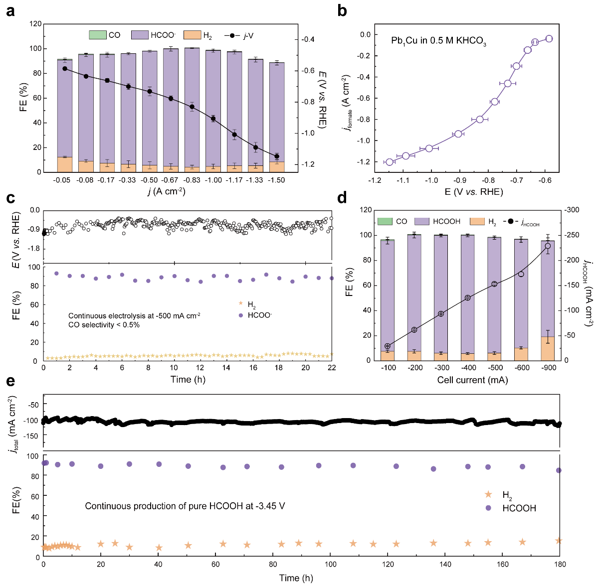 随后研究人员使用流动电解池对催化剂的二氧化碳电还原性能进行评估,发现单原子修饰的铜催化剂在二氧化碳电还原中选择性偏向甲酸,其中以铅单原子修饰的铜催化剂性能最优:甲酸法拉第效率最高可达96%,偏电流密度达800毫安每平方厘米,此外,当甲酸偏电流密度达1安培每平方厘米时,其法拉第效率仍保持在90%以上。