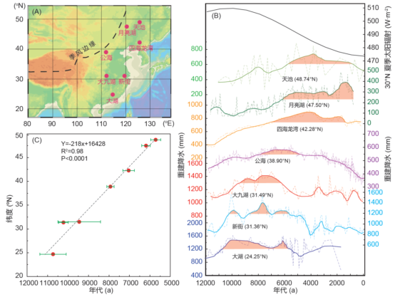 图1东亚季风区降水重建记录的位置(A)、降水重建记录对比(B)及全新世降水最大期出现时间与纬度的线性关系(C)