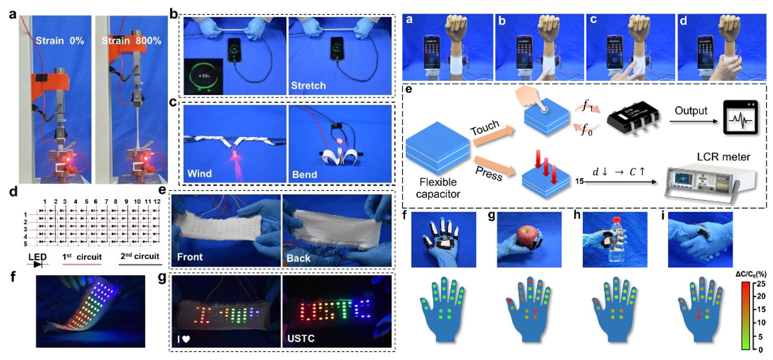 图2. 柔性电子器件应用实例:超级可拉伸纤维、柔性显示屏、触觉传感器等