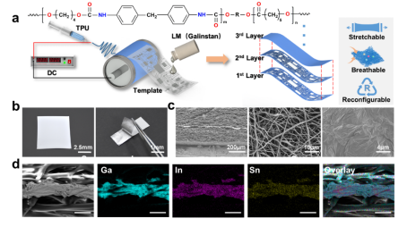 针对上述挑战,中国科大信息学院赵刚课题组提出了一种简单、快速、绿色化的柔性电子器件制备技术。通过静电纺丝技术获得热塑性聚氨酯(TPU)纳米纤维膜作为柔性基底,然后利用模板印刷在基底膜上构造液态金属(LM)图案化电路(图1)。此外,可以通过逐层组装的策略来参数化制备柔性电路、电阻器、电容器、电感器及它们的复合器件。该方案制备的柔性电子器件具有优异的可拉伸性、透气性和稳定性,同时它们是多层和可重构的。研究人员演示了该策略的广泛应用前景例如:柔性显示器、柔性应变传感器、柔性触觉传感器(图2),柔性NFC通讯设备等,最后他们还演示了柔性电子设备的回收和重构这一绿色化方案(图3)。这种新颖的制造策略将对柔性电子产品的开发和商业化产生积极影响。