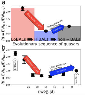 在活动星系早期,星系中心超大质量黑洞-吸积盘被浓厚的尘埃包裹,但此时星系中心黑洞已经驱动尘埃和气体产生非常强烈的外流。因此这个阶段在光谱上表现为:光谱因尘埃消光会很红,同时存在明显的低电离的蓝移吸收线。这个时期星系中有大量的尘埃和气体,并且外流仅存在于星系中心小尺度上,对恒星形成还未有影响。因而这个时期有着非常剧烈的恒星形成。根据这个类型的源比例可以大约推测,这个阶段的维持时间一般不超过百万年。随着时间的演化,外流尺度在增加,并且冲出尘埃的包裹,到达星系尺度,尘埃消光减弱,光谱变蓝,同时外流气体电离度提高。因而在光谱上表现为低电离吸收线消失,仅表现为高电离吸收线。这个时期外流对恒星形成产生显著的压制作用。根据这个类型的源比例可以大约推测,这个阶段的维持时间一般超过千万年的时标。值得一提的是典型的大质量O型星的典型寿命约为数百万年。因此在这个时期,我们看到恒星形成率的显著下降在时标上是自洽的。随着尘埃和气体含量的减弱,外流逐渐减弱,外流对恒星形成的压制作用也在减弱,因而会出现恒星形成的反弹现象。该观测结果表明外流对星系的恒星形成存在着全局性的压制作用。