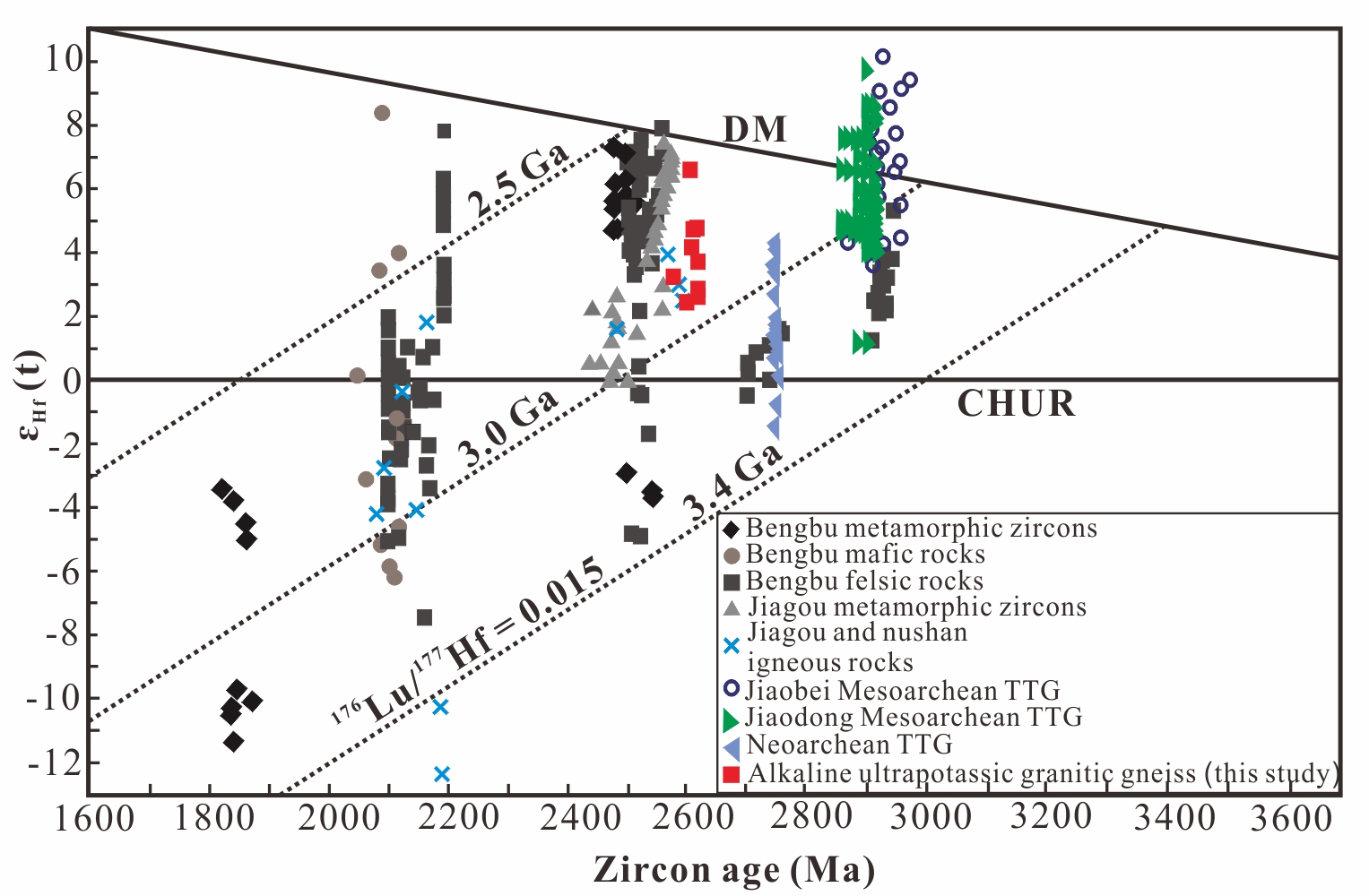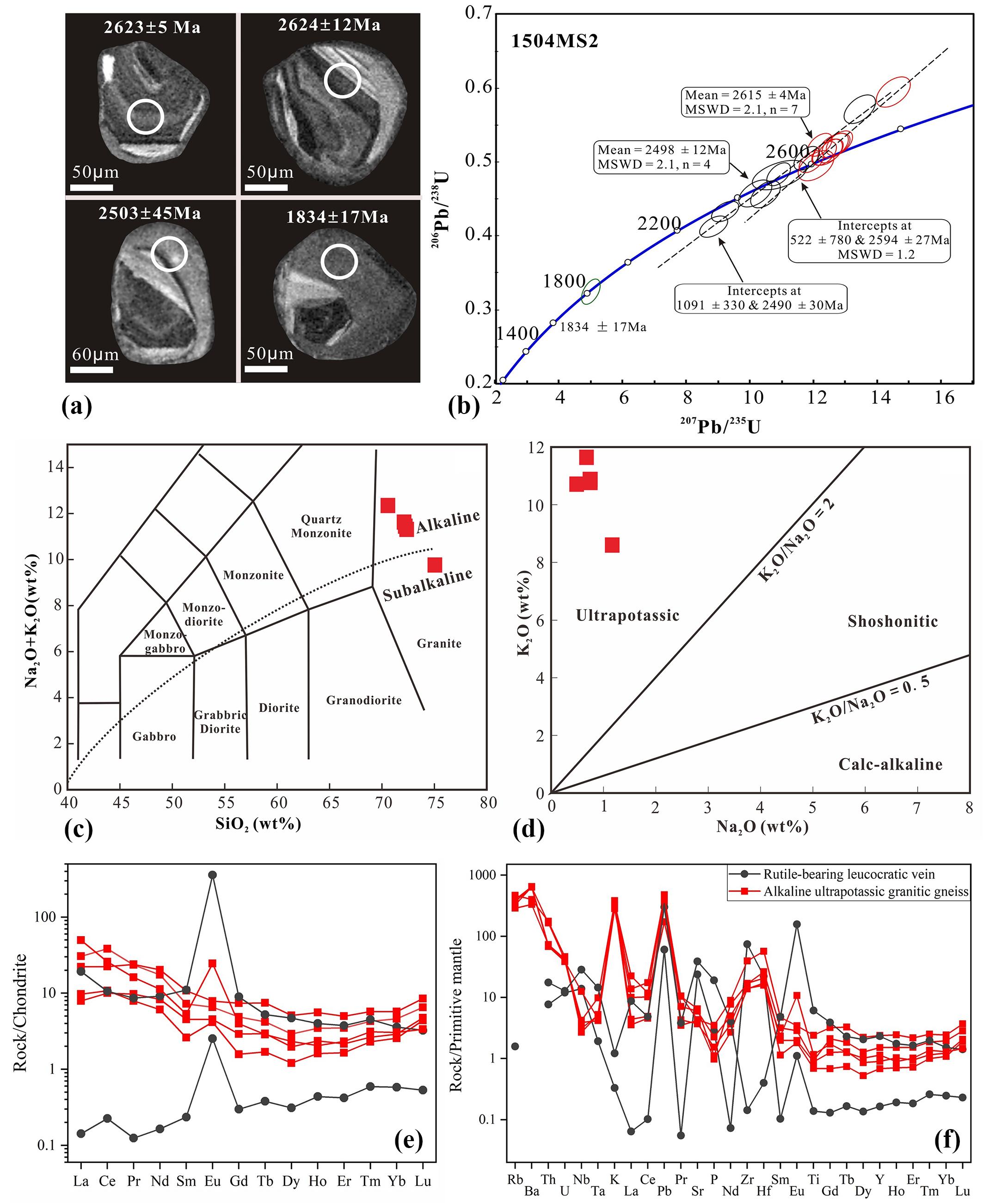 锆石U-Pb年代学研究结果(图1a、b)表明,碱性超钾质花岗片麻岩的原岩形成时代为26亿年,并经历了~25亿年麻粒岩相变质;随后,又在18.5亿年经历了与古元古代碰撞造山作用有关的变质作用叠加。该片麻岩富硅、碱,属于硅饱和的碱性超钾质花岗岩,并具有轻微过碱性到过铝质特征(图1c、d)。此外,样品具有明显的Eu正异常,以及较强的Nb、Ta、P和Ti负异常和显著的Pb正异常,并表现出显著富集大离子亲石元素(图1e、f)。上述结果证明华北克拉通东南缘确实存在约26亿年的碱性超钾质花岗岩。