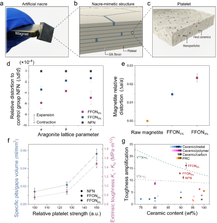 图1.仿珍珠母结构陶瓷实物图和结构示意图以及残余应力与韧性分析。a-c.实物图以及合成示意图;d.通过HRXRD数据定量计算得到的添加不同含量纳米颗粒材料内文石基元的压缩情况;e.通过HRTEM分析得到的四氧化三铁相应的晶格拉伸情况;f.压汞实验测得的片滑移抽出后留下的孔体积与片强度关系图;g.增韧放大效果与陶瓷含量的Ashby图。