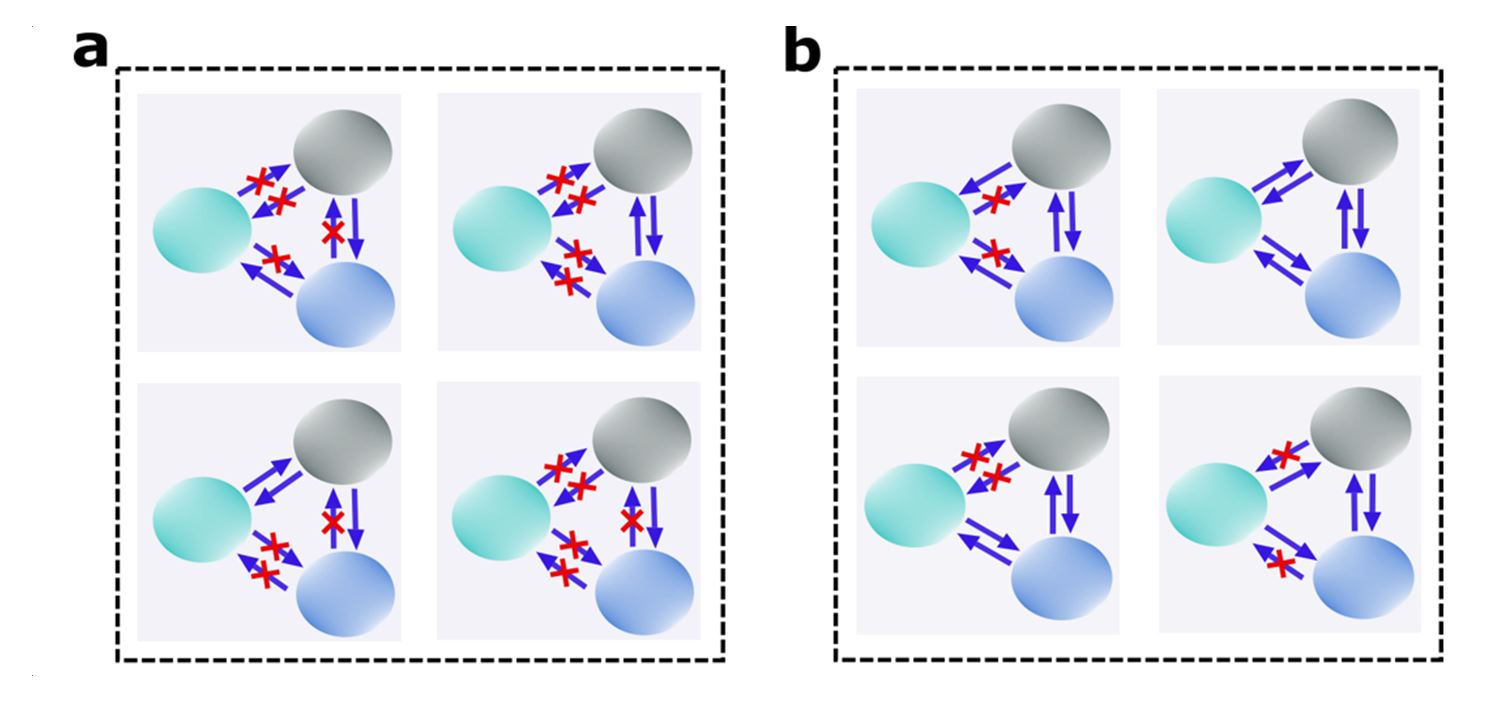 图1,三体系统中的量子导引结构。其中不带叉箭头表示一方可以导引另一方,带叉箭头表示一方不可以导引另一方。a.量子导引的单配性关系结构。任何一方不能被另外两方同时导引;b.违背单配性的共享关系结构。某一方可以被另外两方同时导引。