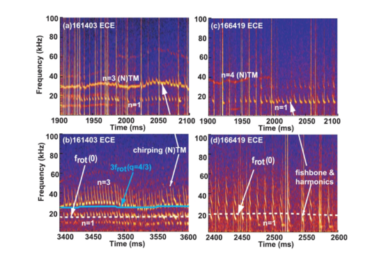 另一方面,文中也对撕裂模对通行快粒子和捕获快粒子的约束和输运的影响做了综述。分析了撕裂模导致通行快粒子和捕获快粒子损失的不同机制,并且重点分析了快粒子与撕裂模的共振导致的撕裂模(包括新经典撕裂模)频率啁啾现象和相应的快粒子损失。同样的,也从实验和理论两个方面进行了验证。