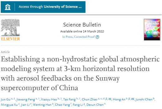 J. Gu, J. Feng, X. Hao, T. Fang, C. Zhao, H. An, J. Chen, M. Xu, J. Li, W. Han, C. Yang, F. Li, D. Chen: Establishing a non-hydrostatic global atmospheric modeling system at 3-km horizontal resolution with aerosol feedbacks on the Sunway supercomputer of China,Science Bulletin,https://doi.org/10.1016/j.scib.2022.03.009