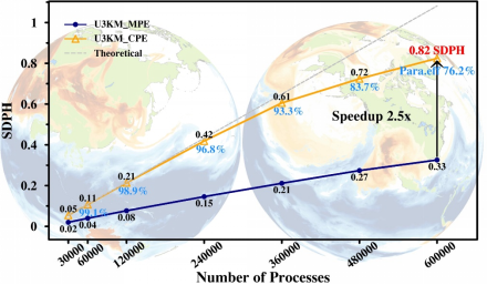 图3全球大气3公里空间分辨率的大规模并行模拟效率示意图