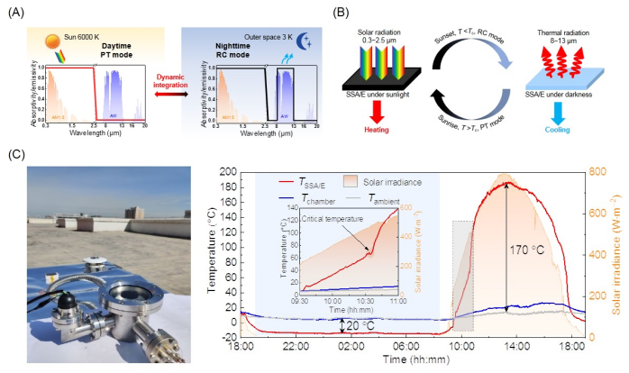 人类社会使用的绝大部分能源均来自于太阳辐射,能源做功利用之后的余热则可以通过中红外热辐射散失到低温太空中去。从热力学的角度来看,太阳和太空是地球能量循环的终极热源和终极冷源。光热转换通过对太阳辐射直接利用,获得高温热能;而天空辐射制冷可以将地表能量以红外辐射形式通过大气窗口(8-13μm)直接发射至低温太空,获得低温冷量,实现对深空低温的超远距直接利用。然而,目前的光热转换和天空辐射制冷都依赖于静态的光谱选择性涂层,但两种过程存在红外光谱冲突,目前技术都是对单一目标、单一功能的利用。基于此,团队创新性提出利用光谱自适应调控机制对太阳热源和太空冷源进行时间解耦,突破目前对太阳热源和太空冷源的单一利用方式。