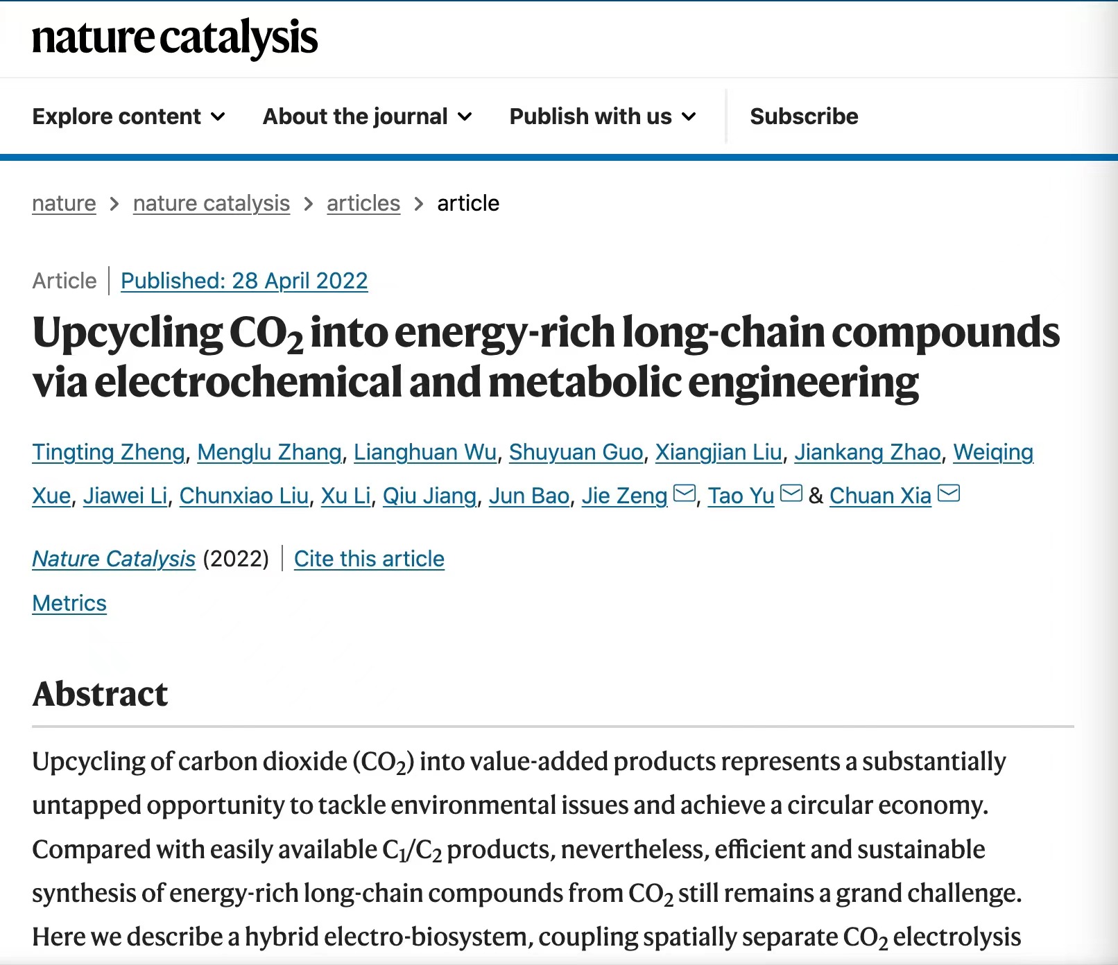 4月28日,中国科学技术大学曾杰课题组与电子科技大学材料与能源学院的夏川课题组、中国科学院深圳先进技术研究院合成生物学研究所于涛课题组合作,在Nature Catalysis发表了题为“Upcycling CO2into energy-rich long-chain products via electrochemical and metabolic engineering”的文章。该工作首先通过电催化将二氧化碳和水合成高纯乙酸,再以乙酸及乙酸盐为碳源经生物发酵合成葡萄糖和脂肪酸等长碳链分子。在该研究中,曾杰为共同通讯作者。