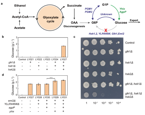 随后,研究人员将电合成得到的高纯乙酸溶液投喂给酿酒酵母,以期通过酵母的代谢工程进一步合成出葡萄糖等食品分子。为此,研究人员对酿酒酵母进行了基因编辑。酿酒酵母中,乙酰辅酶进入乙醛酸循环合成草酰乙酸经糖异生途径形成葡萄糖-6-磷酸。研究人员将酿酒酵母中三个己糖激酶(Glk1、Hxk1、Hxk2)敲除,废除酿酒酵母菌株利用葡萄糖能力,同时获得葡萄糖“泄露”表型。如图3所示,敲除三个己糖激酶后,工程菌株在摇瓶发酵条件下,葡萄糖产量为1.7 g/L。之后,继续敲除两个假定己糖激酶(YLLR446W, EMI2),同时过表达来自泛菌属的葡萄糖磷酸酶基因agpP和大肠杆菌的HAD4(haloacid dehalogenase-like phosphatase 4)基因yhix,葡糖糖产量达2.2 g/L,产量提高30%。