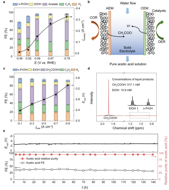 精确控制C1分子实现C-C偶联合成特定C2化合物是当前电催化合成的难点。研究人员发现电催化C1分子合成乙酸特异性地受催化剂表面几何结构影响,并通过理论模拟发现晶界结构能有效提高C1分子转化效率。首先,研究人员利用Ni-N-C单原子催化二氧化碳形成一氧化碳中间体,其法拉第效率近100%[1]。然后将收集的一氧化碳经脉冲电化学还原工艺形成的晶界铜催化合成乙酸。在气体扩散流动池中,乙酸盐法拉第效率最高可达52%;最高偏电流密度可达321毫安每平方厘米,此时乙酸盐法拉第效率仍保持在46%。为降低液体产物与电解质溶液及相关副产物分离成本和方便产物乙酸的下游利用,研究人员进一步开发了多孔固态电解质反应器[2],使阴极得到的乙酸根与阳极得到的氢离子结合形成高纯乙酸水溶液,无须分离提纯可直接用于下游生物发酵。通过新型电解装置测试,催化剂可在250毫安每平方厘米偏电流密度条件连续140小时制得纯度为97%的乙酸水溶液,从而解决了电合成过程中“浓度”与“纯度”两个关键难点。如图2所示。