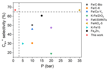 长链烯烃(C4+=)在精细化工领域具有广泛的应用,例如用于合成洗涤剂、高辛烷值汽油、润滑油、农药、增塑剂等。目前合成长链烯烃的主要途径是依赖于石油化工工业的烯烃聚合。如果利用可再生能源电解水制氢,再与温室气体二氧化碳反应直接制备长链烯烃,则会有巨大的环境效益。由于电解水设备规模小、布局分散,为了直接对接电解水制氢,需要使二氧化碳加氢反应在常压下进行。然而,目前二氧化碳加氢制备长链烯烃多在高压反应条件下进行。并且,根据勒夏特列原理,常压不利于长链烯烃的形成。因此,实现二氧化碳常压加氢制备长链烯烃仍然是一个巨大的挑战。