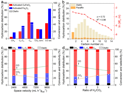 图1.(a)与传统铁基催化剂性能对比。(b)烃类产物碳数分布。(c)不同的空速下的性能对比。(d)不同H2/CO2比下的性能对比。