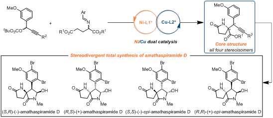 此外,研究人员还发展了一类新型双金属协同催化立体发散性合成策略,通过Ni/Cu双金属协同催化体系,两种金属手性催化剂分别活化两种底物并控制手性中心的立体构型,以优异的对映选择性和非对映选择性合成了具有相邻手性中心季碳氨基酸衍生物的所有四个立体异构体(图2)。基于统一的合成路线,精准可控地实现了天然产物amathaspiramide D的立体发散性全合成,充分证明了该类方法在立体多样性导向合成中的应用前景。