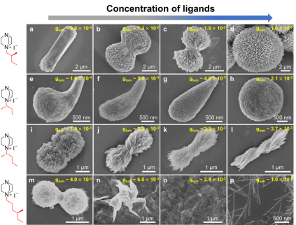 图2.配体手性中心位置、链长及浓度对手性多级结构微晶形貌的影响