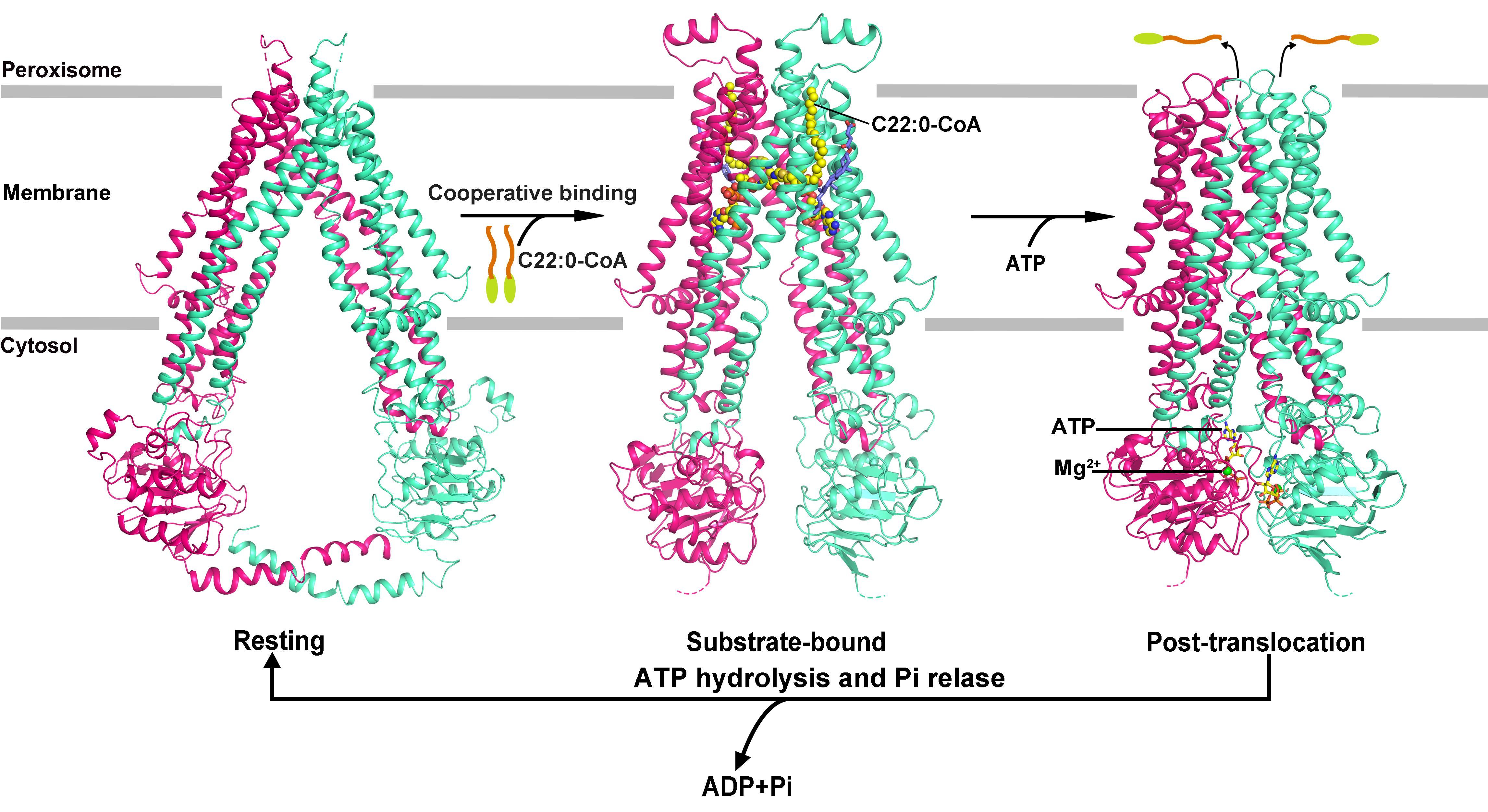 结构分析表明,apo-form ABCD1结构呈现向细胞质基质开口 (inward-facing)的构象:两个核苷酸结合结构域(NBD)彼此分开,两个跨膜结构域(TMD)形成一个朝向细胞质基质开放的“V”形底物转运通道。结合了底物超长链脂酰辅酶A (C22:0-CoA)的 ABCD1结构仍然采用inward-facing的构象,但是底物的结合诱导两个TMD向ABCD1的二重对称轴移动,导致两个TMD朝向细胞基质的通道变窄,两个NBD相互靠近。两个底物分子以一种独特的结合模式结合在两个TMD上:每个C22:0-CoA分子的3'-磷酸-ADP部分结合在一个TMD的富含正电荷的极性口袋中,泛巯基乙胺部分跨越两个TMD之间的空腔,使得后续的脂酰基链插入到另一个TMD与过氧化物酶体膜形成的疏水口袋中。两个底物分子以二重对称的方式结合在TMD上,生化分析结果表明这两个底物分子的结合具有正协同效应,这种效应是在ABC转运蛋白中第一次被发现。在结合了ATP的ABCD1结构中,ATP的结合导致两个NBD发生二聚化,带动TMD转变为向过氧化物酶体基质开放的构象(outward-facing),而跨膜螺旋的重排导致整个底物结合口袋被破坏。最终,底物被释放到过氧化物酶体基质中。该研究不仅为阐明ABCD1的底物转运机制提供了结构基础,还为研究ABCD1突变导致X-ALD的致病机理提供了分子模型。