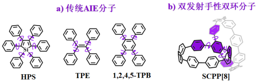 图1. a)传统AIE发光体示例;b) 具有聚集可调双发射性质的手性双环分子(SCPP[8])。