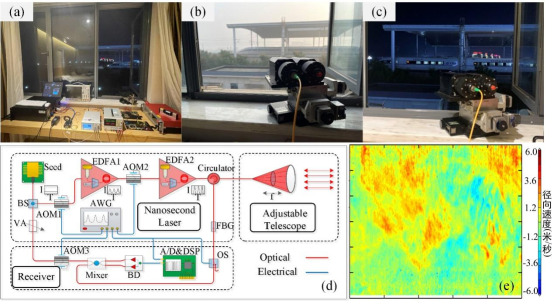 图1 3米距离分辨率相干测风雷达实验装置:(a)实验装置实物;(b)白天观测;(c)夜间观测;(d)光学系统及电路控制示意图;(e)连续5分钟观测的阵风结构图(时间分辨率为1秒)。