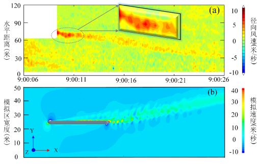 图2 高铁尾流风场结构观测及模拟结果:(a)雷达观测的0.1秒分辨率尾流中风场结构图;(b)基于CCM+模拟的300km/h运行列车的尾流风场结构。