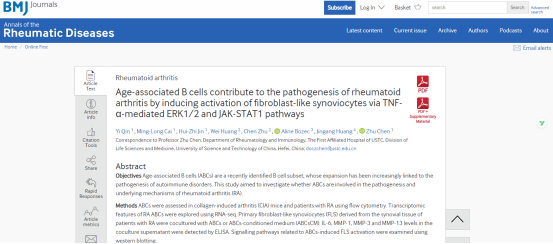 日前,中国科大附属第一医院风湿免疫科陈竹教授团队在类风湿关节炎发病机制研究中取得重要进展,研究成果以“Age-associated B cells contribute to the pathogenesis of rheumatoid arthritis by inducing activation of fibroblast-like synoviocytes via TNF-α-mediated ERK1/2 and JAK-STAT1 pathways”为题发表在国际风湿病著名期刊《Annals of the Rheumatic Diseases》(IF= 27.973)。该研究揭示了年龄相关的B细胞(ABCs)通过活化成纤维样滑膜细胞(FLS)促进类风湿关节炎(RA)发病的作用及分子机制,为今后开发靶向特异性B细胞治疗RA提供了依据。