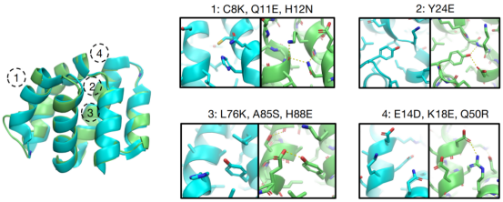 图2. 左侧图为实验验证采用的一个目标主链结构(天蓝色)与相应ABACUS-R设计蛋白晶体结构(绿色)的叠合比较。在右侧展示的局部结构放大图中,ABACUS-R设计蛋白的残基间氢键等极性相互作用不同于天然结构。