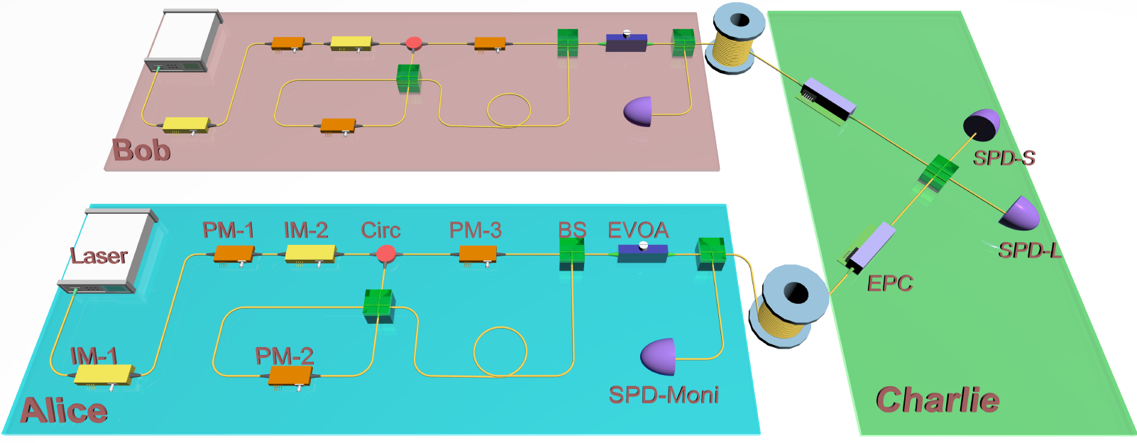 图1.误差容忍测量设备无关量子密钥分发实验结构图
