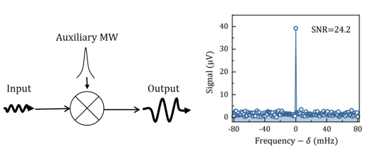 图2:对弱微波的测量。左图为信号放大示意图。右图为实测强度为6.81pT的微波场,测量时间1000秒,信噪比为24.2,对应测量灵敏度为8.9pT Hz-1/2。