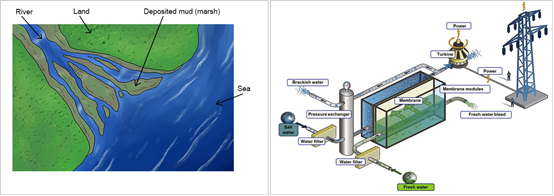 存在于河水与海水之间的盐差能是一种极具潜力的可再生能源(图1)。理论上,河-海交汇处的盐差能密度约为0.8 kWh·m-3,全球各河口区盐差能总储量高达30 TW,可能利用的有2.6TW,我国的盐差能估计为1.1×108kw。用于提取这种能量的方法主要有压力延迟渗透技术(pressure-retarded osmosis,PRO)和反向电渗析技术(reverse electrodialysis,RED)。PRO技术使用半渗透膜,利用渗透压差使水从低浓度侧渗透至高浓度侧,通过溶液体积的增加来驱动涡轮发电机实现发电;RED技术使用离子交换膜,利用不同离子在离子交换膜内的定向选择性迁移,从而直接将化学势能转换为电能,具有投资成本更低、能量密度更高等优势。因此,RED技术引起了广泛的研究兴趣。RED过程存在两个主要挑战。一是缺乏能同时实现高功率密度和高转换效率的膜材料:通过分析前期的研究结果,团队发现基于纳米孔的离子交换膜可以大幅度提高盐差能发电的功率密度,但其能量转换效率依然非常有限(功率密度>1 W m-2,效率大多为?30%),其本质原因是膜渗透性和选择性间存在的相互制约关系;二是盐差能提取的概念仅限于海水和河水(具有明显渗透压差、盐度差)的体系,从工业废水等其他水源中提取能源的研究很少,亟需开发出不受复杂盐组成、溶液pH、温度等影响的能量提取过程,实现多种形式的盐差能提取。