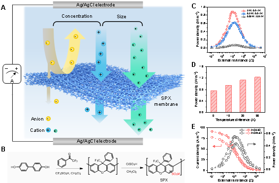 近日,中国科学技术大学应用化学系徐铜文、杨正金团队在用于盐差能发电的离子交换膜方面取得新进展,报道了一种磺化的超微孔聚氧杂蒽基(SPX)离子膜,揭示了软物质限域下的离子传递特性,利用膜内亚纳米的亲水微孔实现了极高的离子选择性,提高了盐差能发电的效率。该膜材料的设计理念也将盐差能发电的概念从海水-河水体系,拓展到无浓差盐溶液、甚至工业废水体系。相关研究成果以 “Sulfonated ultramicroporous membrane with selective ion transport enables osmotic energy extraction from multiform salt solutions withexceptional efficiency”为题发表在Energy & Environmental Science杂志上。