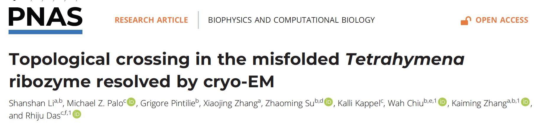 2022年9月6日,中国科学技术大学张凯铭与美国斯坦福大学Rhiju Das、Wah Chiu教授团队合作在美国科学院院刊(PNAS)以直投方式(Direct submission)在线发表了冷冻电镜解析纯RNA三维结构领域的重要研究成果。 这是继2021年8月全长四膜虫核酶冷冻电镜结构被解析(Nature 2021)后,张凯铭团队在该领域的又一重要研究突破。