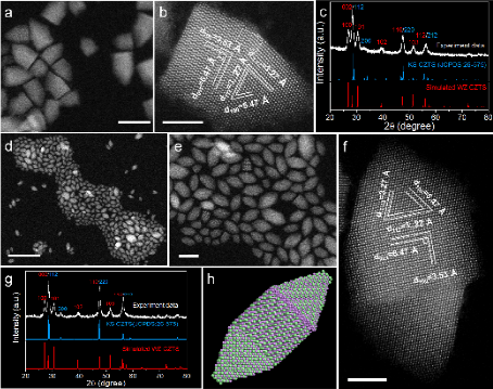 图1.(a-c)单同质结CZTS多形体的HAADF-STEM图、球差校正高分辨率HAADF-STEM图和XRD图; (d-g)双同质结CZTS多形体的HAADF-STEM图、球差校正高分辨率HAADF-STEM图和XRD图;(h)双同质结CZTS多形体的示意图。图a和e中的比例尺代表20 nm,图b和f中的比例尺代表5 nm,图d中的比例尺代表50 nm。