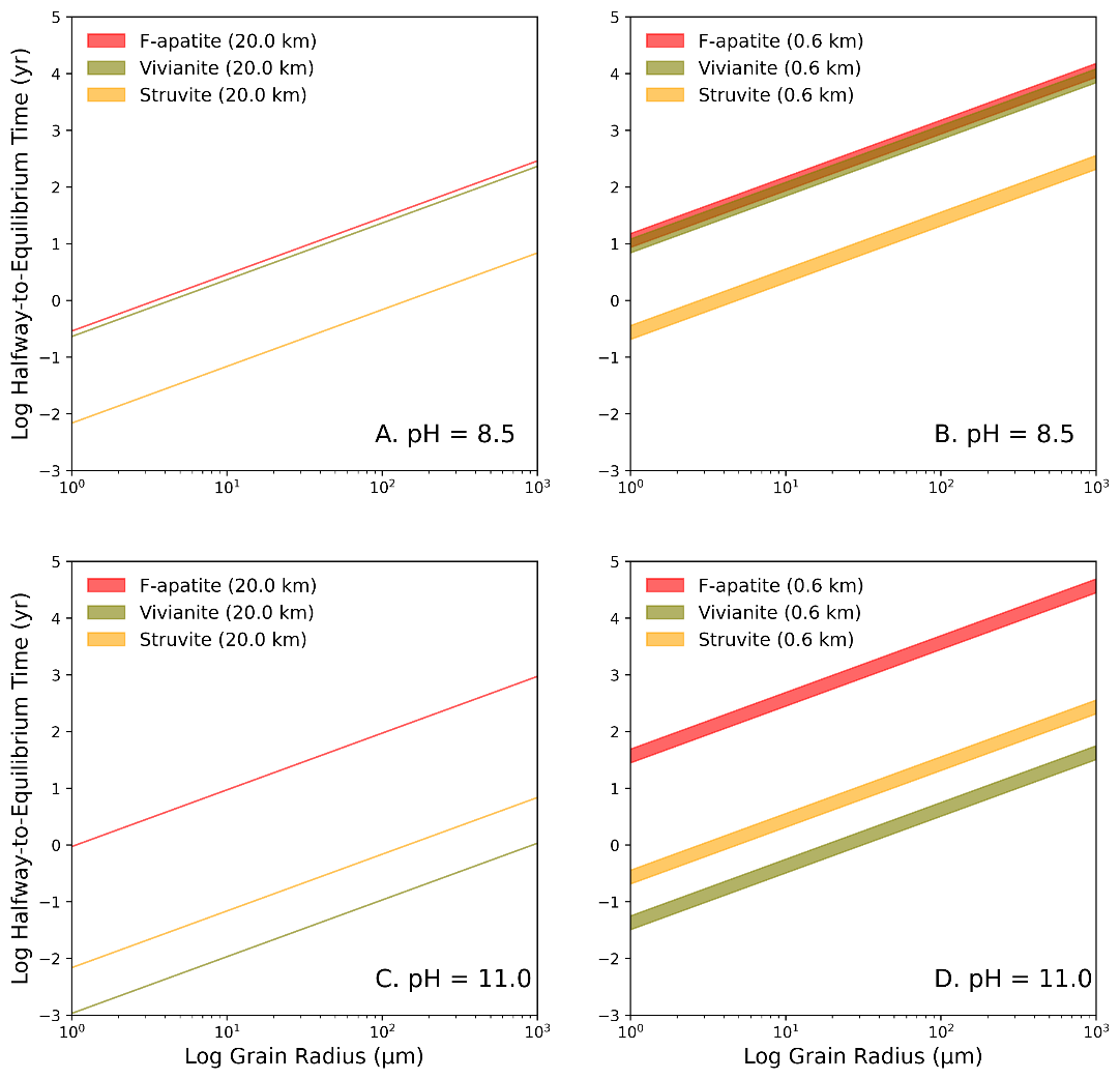 图4. 不同边界条件下,土卫二海水交代核部岩石释放1mM磷酸根所需的时间。