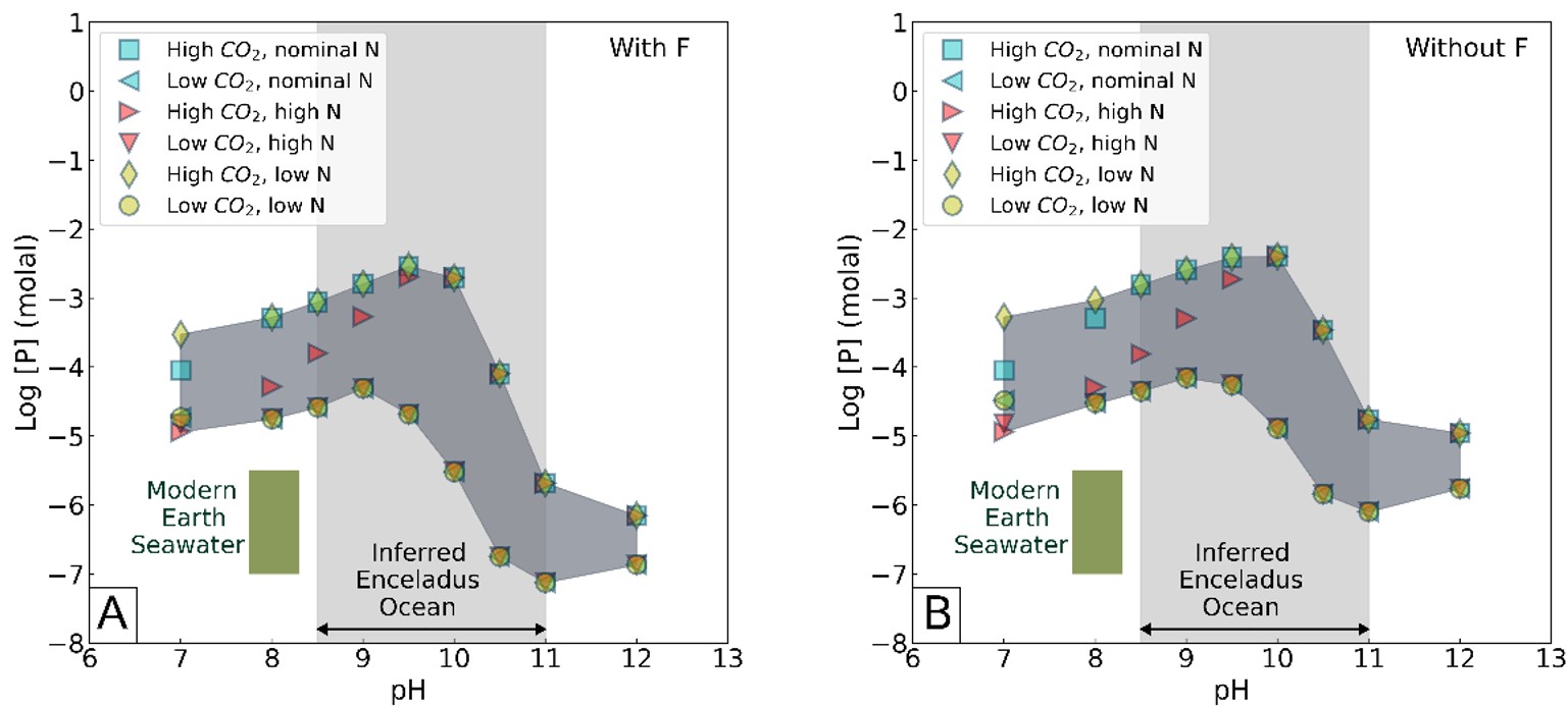 目前,科学家已经在土卫二海水中发现了丰富的碳、氢、氧、氮及少量的硫,但对于生命六大基本构成元素之一的磷仍然没有相关报道。在地球表面水体中,磷往往以正磷酸(HxPO4(3-x)-)的形式存在,且溶解度极低,因此被普遍认为是限制生命起源和生物生产力规模的关键营养元素。不同于地球海水,土卫二海水被认为是碱性(pH = 8.5 - 11)且还原性(含有大量的H2)。这种迥异的海水化学到底会对磷化学产生什么影响呢?土卫二海洋中的磷元素会不会是限制其生命宜居性的关键?