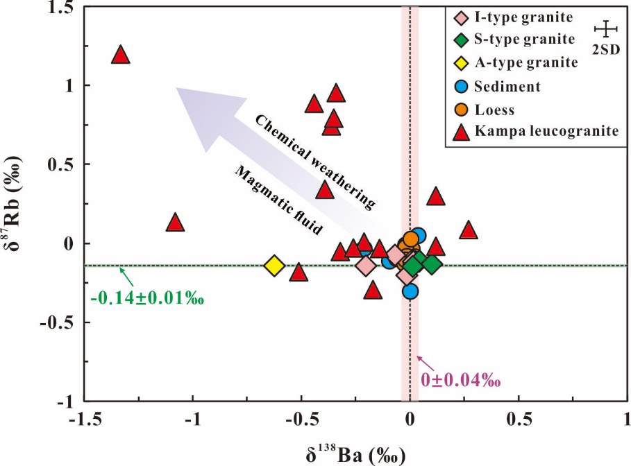 该团队进一步测量了产自青藏高原的康巴淡色花岗岩的Ba和Rb同位素组成。这些花岗岩由变沉积岩熔融形成,在大陆造山带的背景下高度演化,富集Li、Rb、Be等关键金属,具有重要的找矿意义。测量结果表明,康巴淡色花岗岩具有明显偏轻的Ba同位素组成,其Rb同位素组成则比平均大陆上地壳显著偏重(图2)。这些偏轻的Ba同位素和偏重的Rb同位素组成不是分离结晶、部分熔融、化学风化过程和源区过程造成的,而是一致的反映了来自深部岩浆的流体特征。两个流体活动元素的同位素联合示踪,对于研究示踪岩浆-热液过程有明显优势。