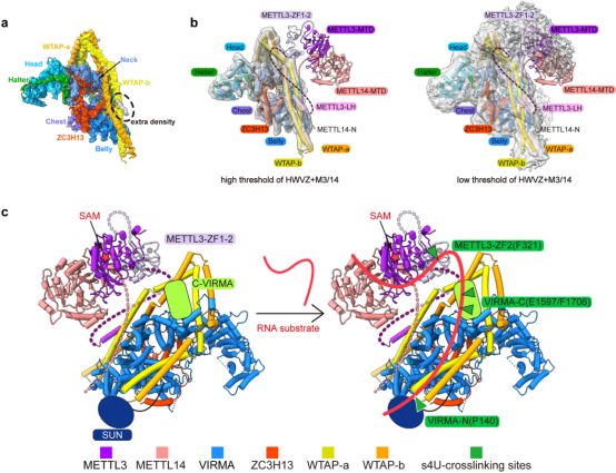 图3. MAC与MACOM复合物的相互作用以及整体的底物结合模式图。a,在高阈值下的MAC-MACOM复合物电镜密度中放入MACOM复合物的结构,多余密度用虚线圈出。b,基于电镜密度和生化结果的MAC-MACOM复合物模型,左图为高阈值密度图,右图为低阈值密度图。c,根据s4U-RNA和MAC-MACOM复合物的交联质谱结果提出的m6A甲基化酶复合物与RNA底物的作用模型。
