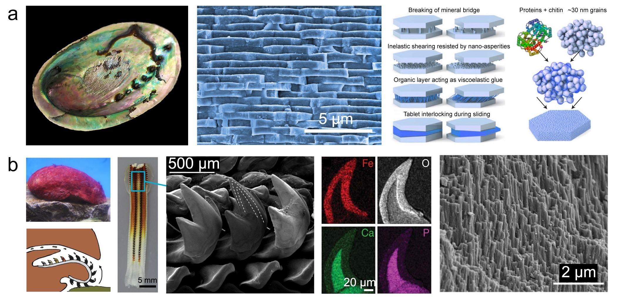 图1. 生物矿物结构材料的复杂多级次结构。(a)珍珠母层状结构及增韧机理;(b)石鳖牙齿的分层结构及层内取向结构。