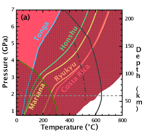 该课题组利用第一性原理计算方法确定了俯冲带温压条件下利蛇纹石的弹性性质,发现其具有很强的波速各向异性,其剪切波各向异性几乎是其高压相叶蛇纹石的两倍。地震学研究发现,大多数俯冲带的浅部都存在剪切波分裂且快波方向平行于海沟的现象。在一些俯冲带,如汤加与中美洲等地,其剪切波分裂的延迟时间可以达到~2s,表明这些俯冲带下方具有非常强的各向异性。如此大的延迟时间很难用橄榄石等常见地幔矿物的定向排列解释。