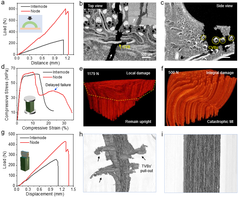 在拱形径向压缩(图2a-c)、单向轴向压缩(图2d-f)、轴向劈裂(图2g-i)等不同模态载荷作用下,研究人员研究了竹节中环向纤维束(位于竹节壁和隔膜的过渡区,图2b-c)和横穿纤维(位于竹节壁,图2e,h)等几种关键纤维的结构演变和破坏情况。进一步结合三维X射线计算机断层扫描和微裂纹重构技术以及理论模拟分析(图2b-c,e-f,h-i),验证了几种关键纤维和纤维增强结构设计方案在维持竹节和竹体结构稳定性方面的重要贡献。