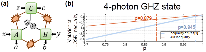 在量子资源理论中,LOCC并不是唯一可以用来定义纠缠资源的免费操作,在去除经典通信后,一个更为自然的定义是基于LOSR的理论框架。在实验中,研究组先验证了三体纠缠结构的非局域性。该三体系统的LOSR局域模型允许三体之间具有共享随机性,并允许对任意两体之间的关联不设限,即允许其关联可以是量子关联,也可以具有更为广泛的不依赖量子力学描述的广义概率理论(Generalized probabilistic theory)所允许的关联。研究组联合Marc-Olivier Renou等人对此前相关理论工作中提出的LOSR非局域性不等式进行改进,针对多光子实验中常见的白噪声提出了鲁棒性更强的不等式,并在实验中利用自主研制的“三明治型”高保真度多光子纠缠源[PRL115, 260402 (2015)]以26.3个标准差的违背验证了真三体LOSR非局域性。研究组进一步在四体情形实验违背了真四体LOSR不等式,实验排除了基于共享随机性和三体广义关联的局域性模型,展示了真四体非局域性。这些实验结果表明仅两体或三体非局域关联无法解释自然界产生的所有关联。该工作中提出的不等式可以拓展到任意N体情形,而制备高保真度纠缠源的方法为实验展示更大量子系统非局域性打下基础。
