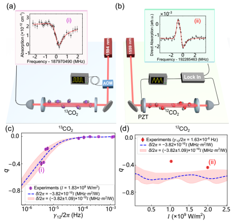 图2:(a)-(b)分别为测量13CO2和12CO2分子饱和吸收谱的实验装置示意图以及在实验中观测到的不对称吸收线型;(c)-(d)吸收线型不对称程度与不同参数的依赖关系的实验结果(圆点)与理论预测(虚线以及粉色区域)的对比。