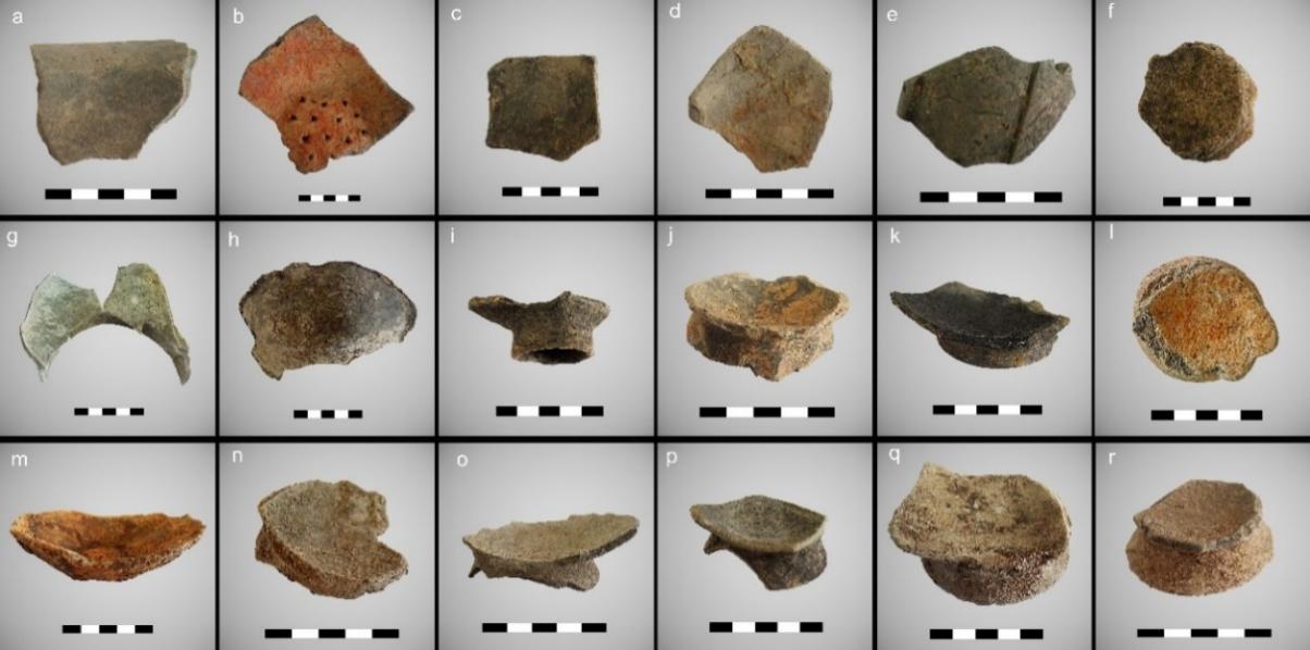 近年来我校人文与社会科学学院科技史与科技考古系杨玉璋教授团队与湖北省文物考古研究院姚凌副研究员等合作,利用淀粉粒分析方法,对位于江汉平原北缘的屈家岭遗址(5800-4200BP)(图1)出土陶器表面残留物进行了提取与分析(图2),揭示了该遗址油子岭文化至石家河文化时期先民日常消费的植物性食物来源与结构演化。相关成果于10月18日以“Plant foods consumed at the Neolithic site of Qujialing (ca. 5800-4200 BP) in Jianghan Plain of the middle catchment of Yangtze River, China”为题发表于国际植物学著名杂志Frontiersin Plant Science上。