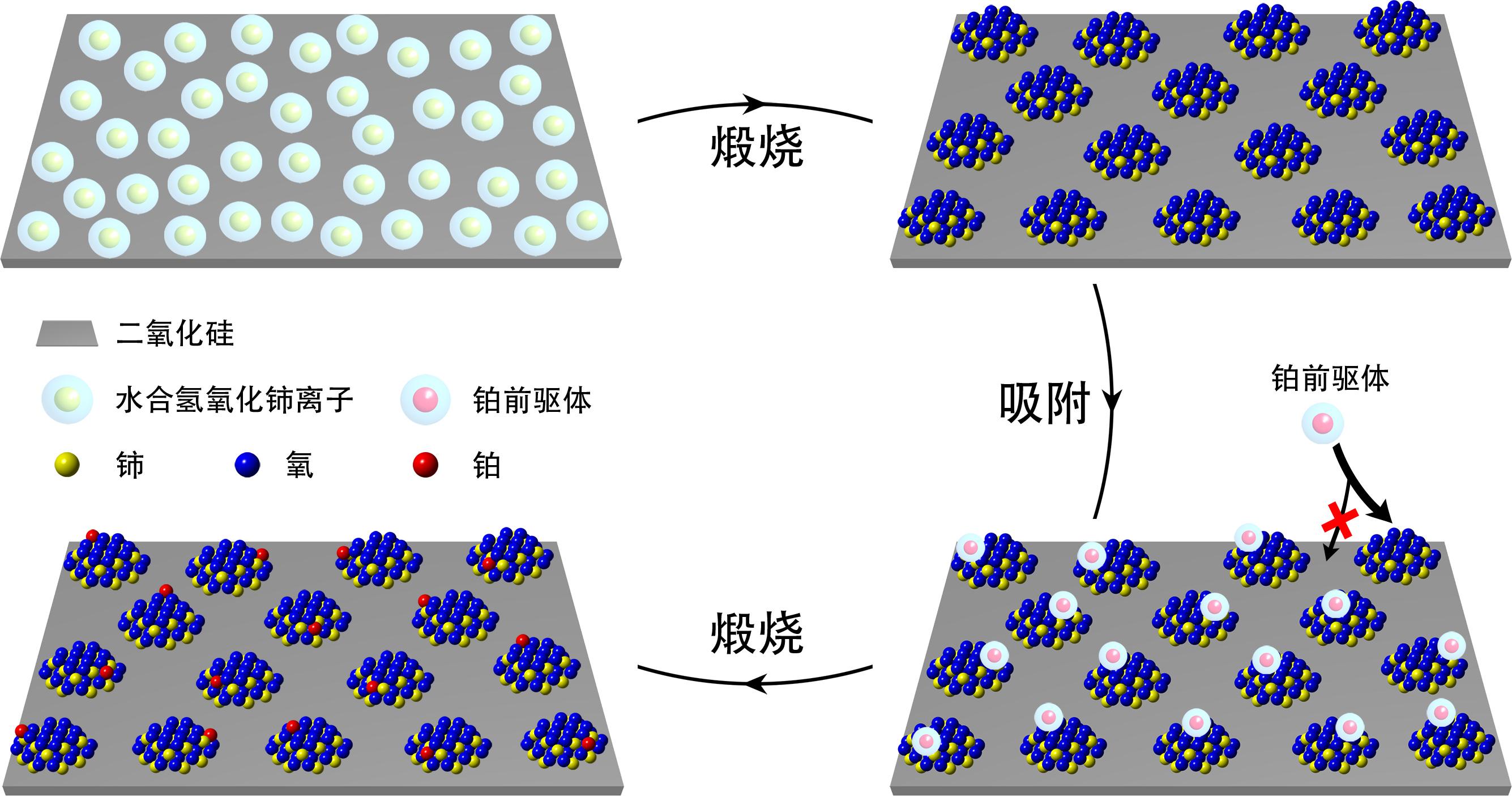 图1.氧化铈“纳米岛”稳定铂原子催化剂的合成过程示意图。