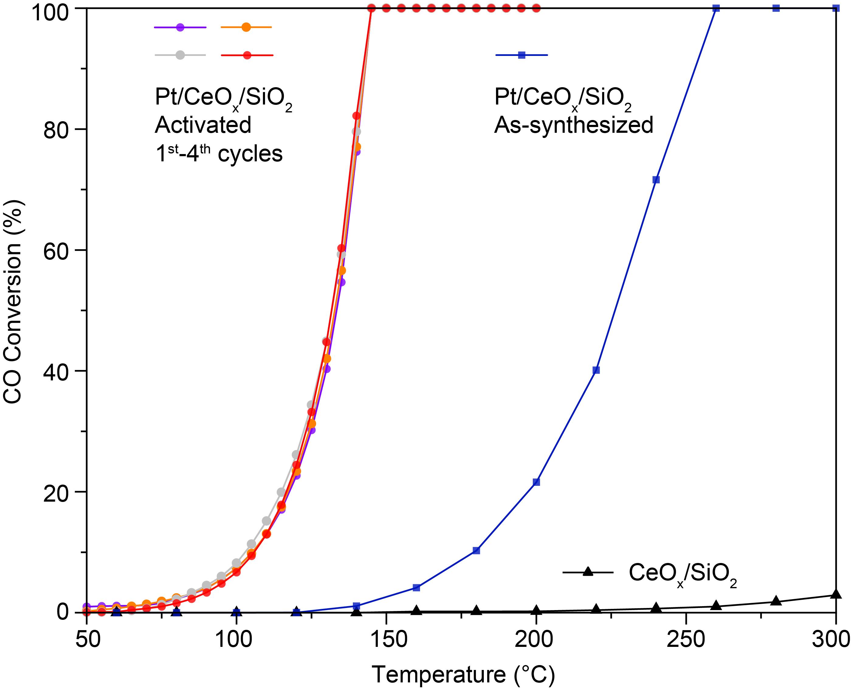 稳定性研究表明,氧化铈“纳米岛”上的铂原子可以抵抗高达600摄氏度的空气煅烧。特别地,铂原子在高温下的氢气氛围中只会限定在“岛”内移动,不会跨“岛”团聚,实现了活性位点的“动而不聚”。经此活化后的催化剂,在催化一氧化碳氧化反应的活性提升两个数量级并兼具高稳定性(图4)。