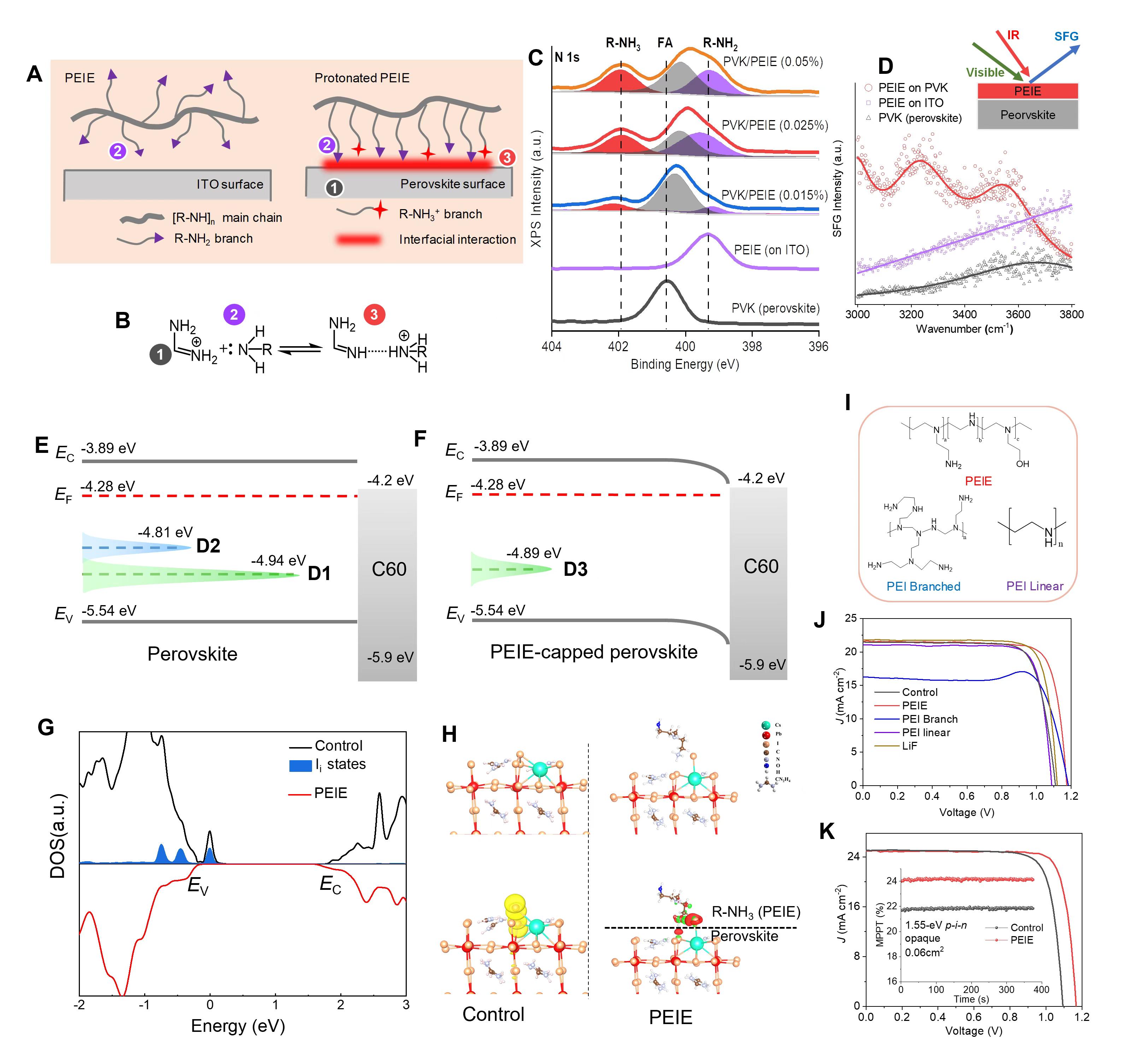 图.(A, B)钙钛矿/PEI原位反应示意;(C)N原子的XPS信号;(D)表面和频信号;(E,F)深能级缺陷瞬态谱DLTS测试结果;(G,H)密度泛函理论(DFT)计算的少数载流子缺陷钝化;(I,J)不同构型PEI的器件效果;(K)1.55eV反式p-i-n器件性能提高