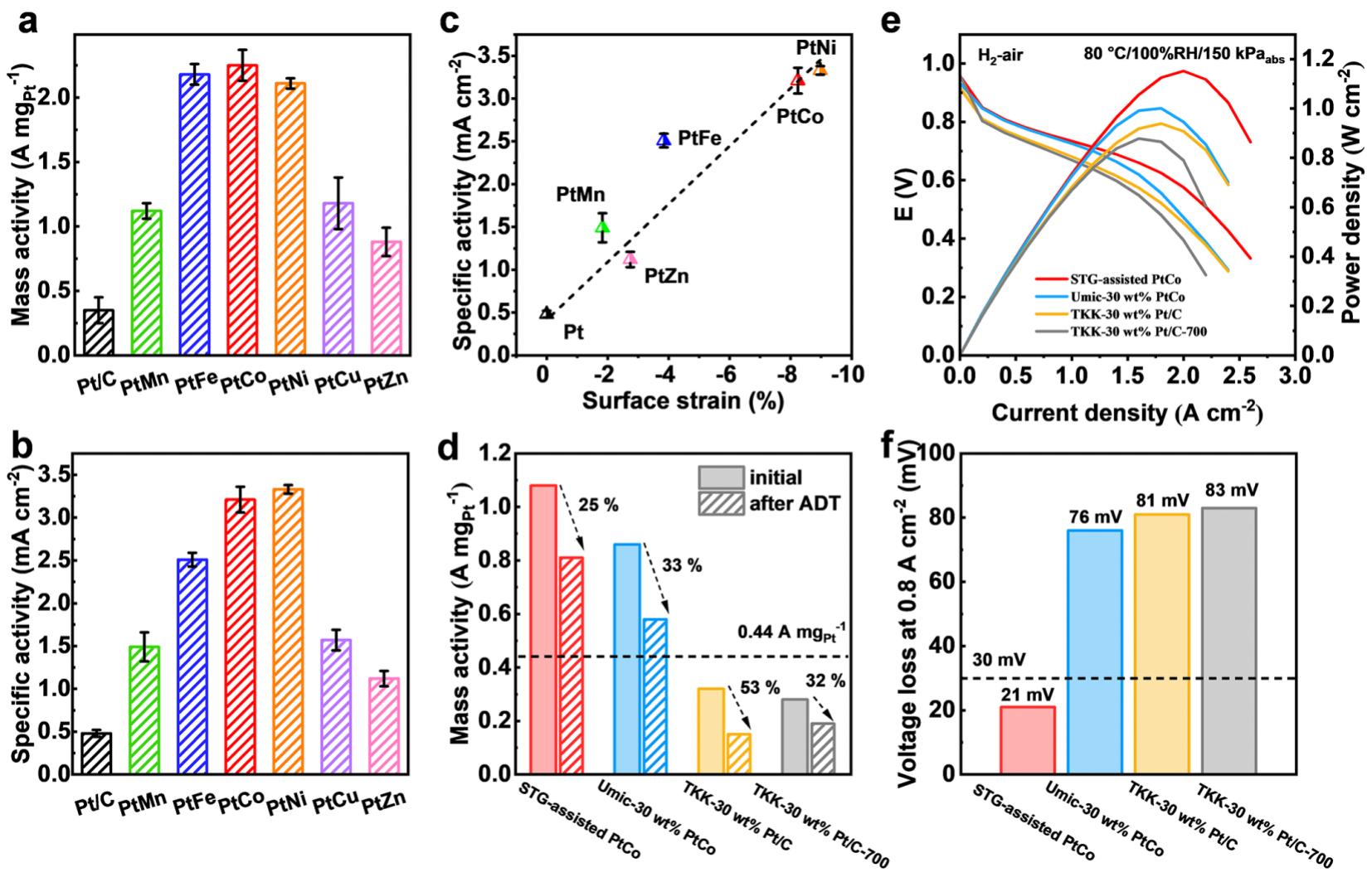 研究人员选择六种所合成的Pt-IMC催化剂进行了电催化和燃料电池性能表征。在旋转圆盘电极测试中,六种Pt/M比例为1:1的IMC催化剂均表现出了由于商业Pt/C的活性,在0.9 ViR-correct的比活性为1.12–3.33 mA/cm2,质量活性(MA)为0.88–2.25 A/mgPt(商业Pt/C的比活性和质量活性分别为0.48 mA/cm2和0.35 A/mgPt)。其中,5种L10型Pt-IMC催化剂的比活性同计算的表面应变存在强关联性。在H2-O2和H2-air燃料电池单电池测试中,所制备的PtCo IMC催化剂也展现出了比商业Pt/C(日本田中)和PtCo(比利时优美科)催化剂更优异的性能,在0.9 V的质量活性达到了1.08 A/mgPt(H2-O2?电池),额定功率可达 1.17 W/cm2(H2-air?电池,94度,阴极Pt用量0.1 mg/cm2),并在30000圈稳定性测试后分别保留了75%和88%的初始性能(图3)。