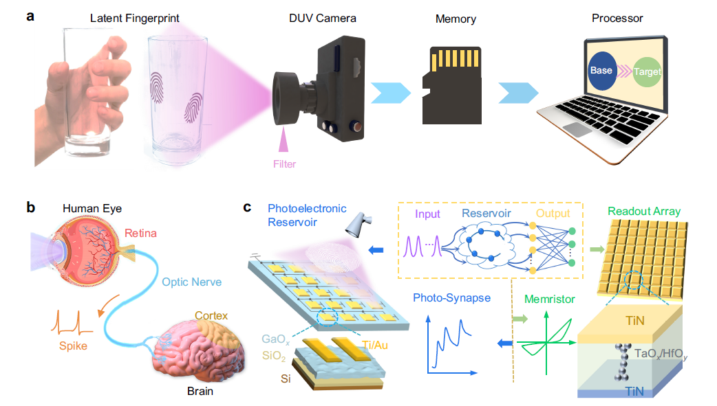 中国科大微电子学院龙世兵教授团队与复旦大学芯片与系统先进技术研究院刘琦教授团队合作,利用深紫外(DUV)光电突触结合忆阻器的构架实现了基于储备池计算(RC)的指纹识别系统,相关成果以“In-sensor reservoir computing system for latent fingerprint recognition with deep ultraviolet photo-synapses and memristor array”为题于11月3日在线发表在学术期刊《Nature Communications》上。