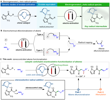 该研究团队开发了一种新型电化学催化烯烃不对称官能团化反应体系,通过Ni (II)金属络合物活化亲核试剂,在阳极氧化产生与手性催化剂结合的自由基中间体,实现了对烯烃的自由基加成反应,加成产物在阳极进一步氧化形成碳正离子中间体,并通过可控路径得到不对称烯烃双官能团化产物(Path I )和烯基化产物(Path II)(图1)。