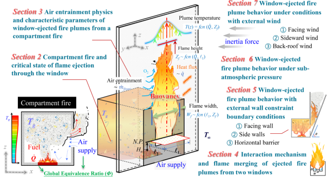 应能源和燃烧领域国际综述类期刊Progress in Energy and Combustion Science邀请,中国科学技术大学火灾科学国家重点实验室胡隆华研究员课题组近期发表了题为“Fundamentals of window-ejected fire plumes from under-ventilated compartment fires: Recent progresses and perspectives”的长篇综述论文。该论文结合胡隆华研究员课题组十五年来在建筑外立面火溢流行为的研究成果和国际研究动态,总结、归纳了不同边界条件下建筑火溢流的动力学演化规律与理论,并对建筑外立面火溢流行为研究进行了未来展望。